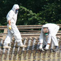 Aufwendig müssen die alten Asbestplatten entnommen und anschließend fachgerecht entsorgt werden. (Alles unter Schutzkleidung)
